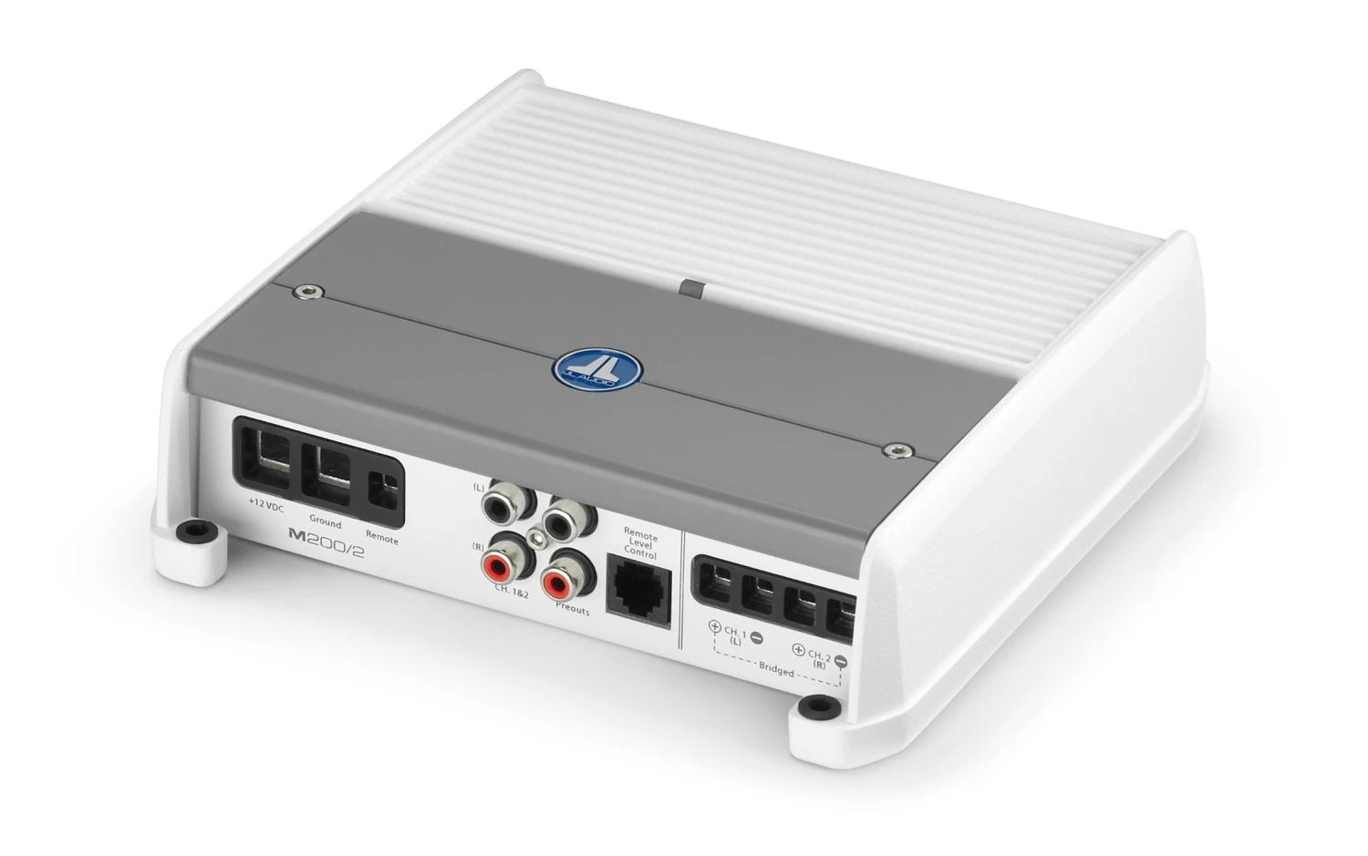 This marine amplifier features white and gray powder-coat finishes, a gasketed cover for the controls and stainless steel hardware for durability in the marine environment.