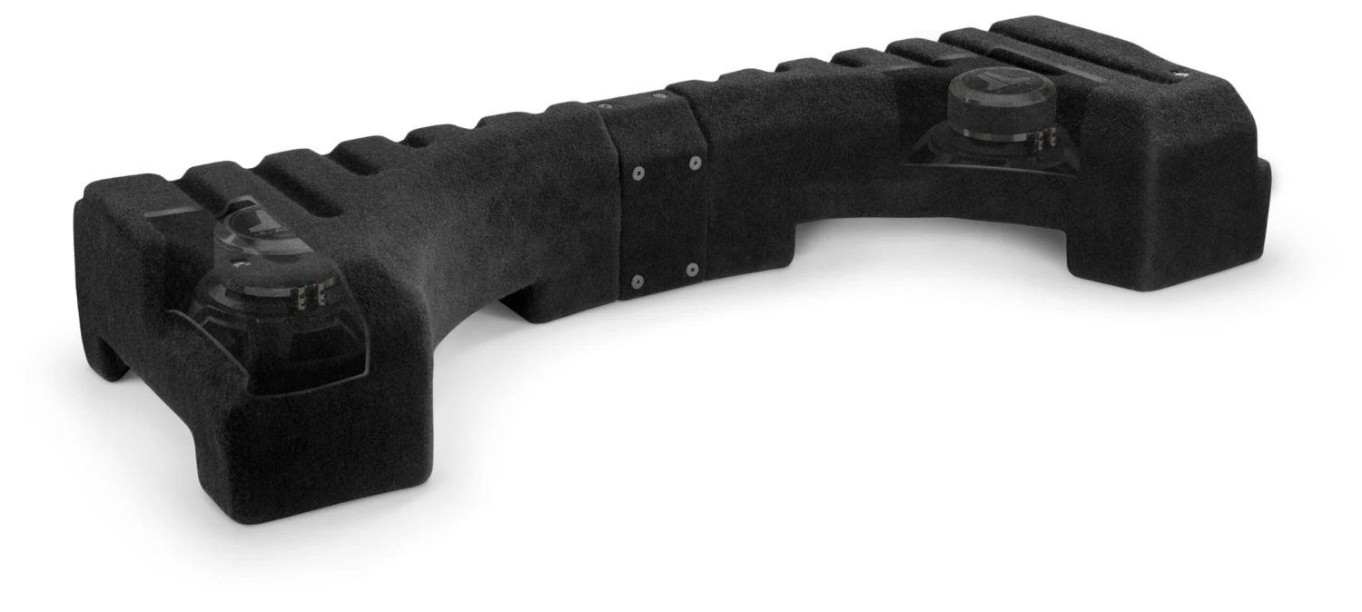 The Hard Data: Contains two 10W1v3-4 Subwoofers in individual sealed, down-firing enclosures. 600 watt power handling. Wired for 2 ohm mono. Installs under the rear deck and does not impede the vehicle’s convertible top operation or access to the under-floor battery compartment. Installation requires permanent modification to the trunk liner and cargo floor cover.