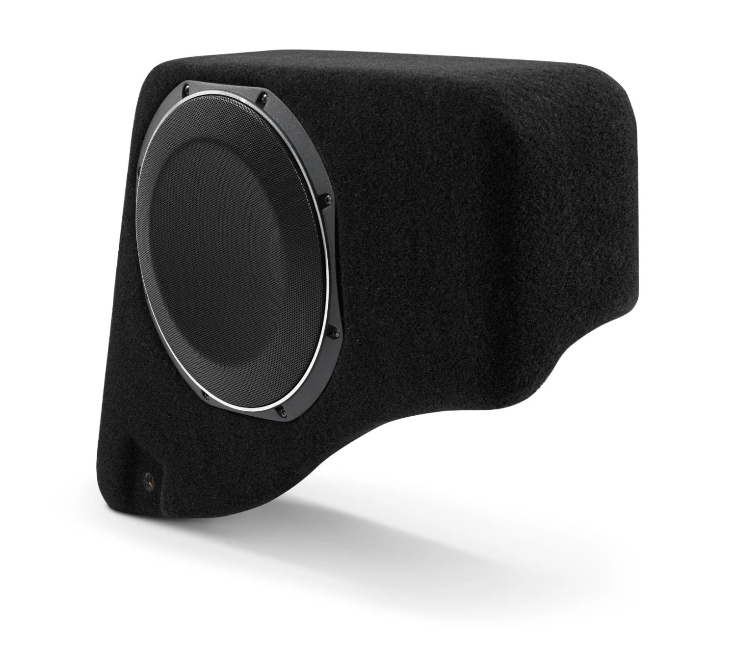 The Hard Data: Each system contains one 10TW1-4 in a sealed enclosure with 300 watt power handling. Each enclosure is wired for 4 ohms (using two achieves a 2 ohm load in parallel). A steel mesh grille is included with each to protect the Subwoofer. Each enclosure installs above one rear wheel well, with specific models for passenger and driver side. Does not affect hard top installation.